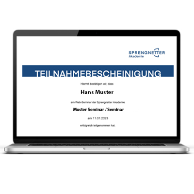 Diese Veranstaltung ist bei der Sprengnetter Akademie und der Sprengnetter Zertifizierung als Weiterbildung im Umfang von 12 Stunden anerkannt. Sie erhalten im Nachgang an die Veranstaltung eine aussagekräftige Teilnahmebescheinigung zur Vorlage bei der Gewerbebehörde oder weiteren Institutionen (Zertifizierung o.ä.).