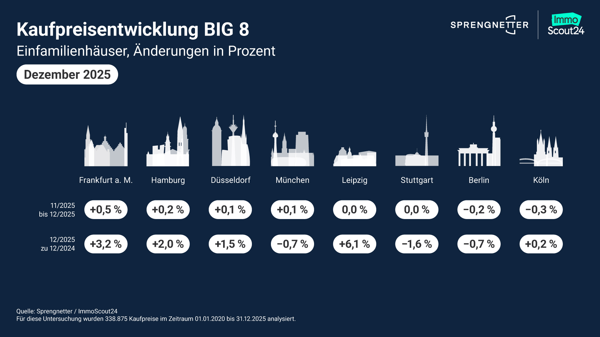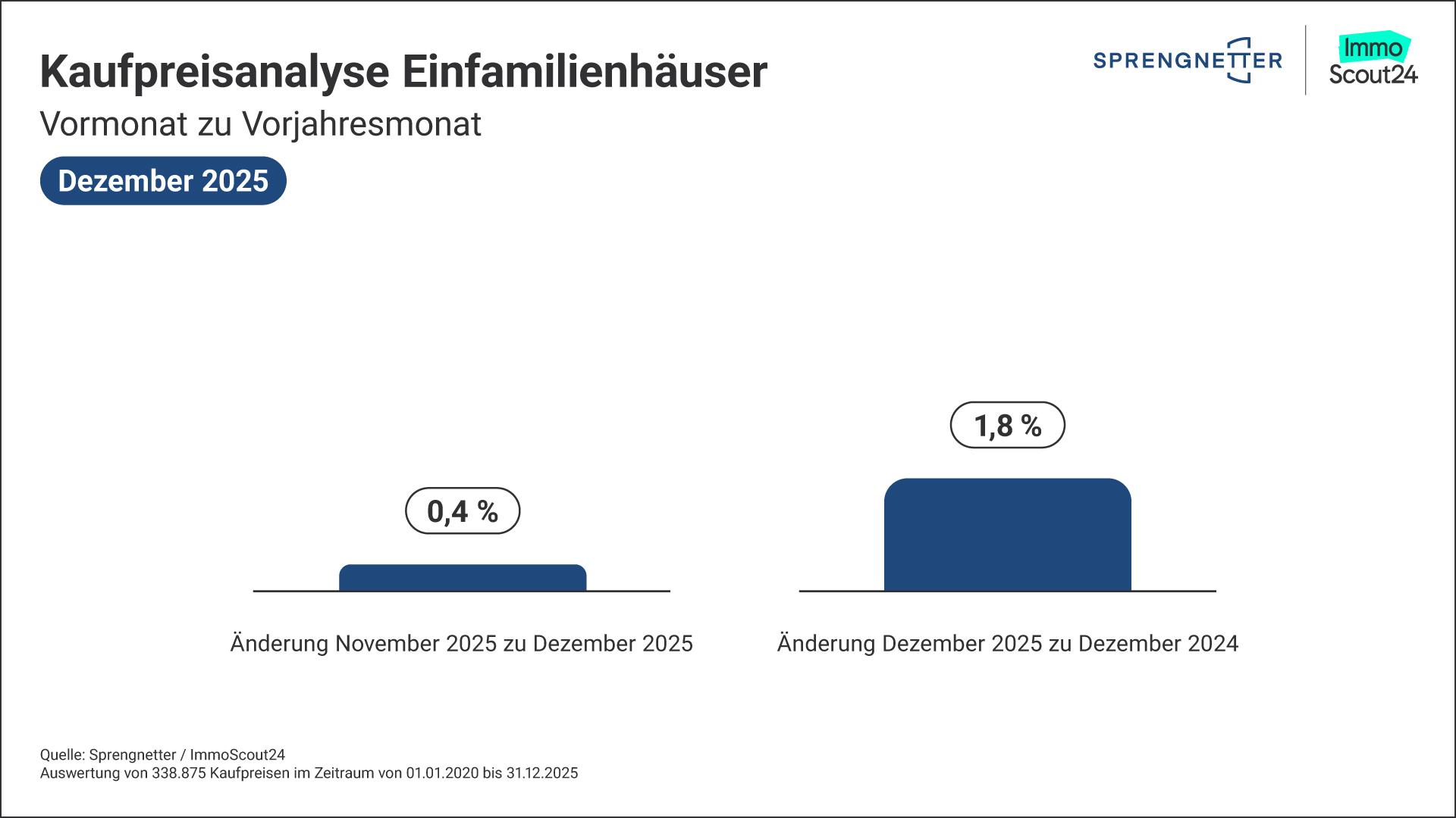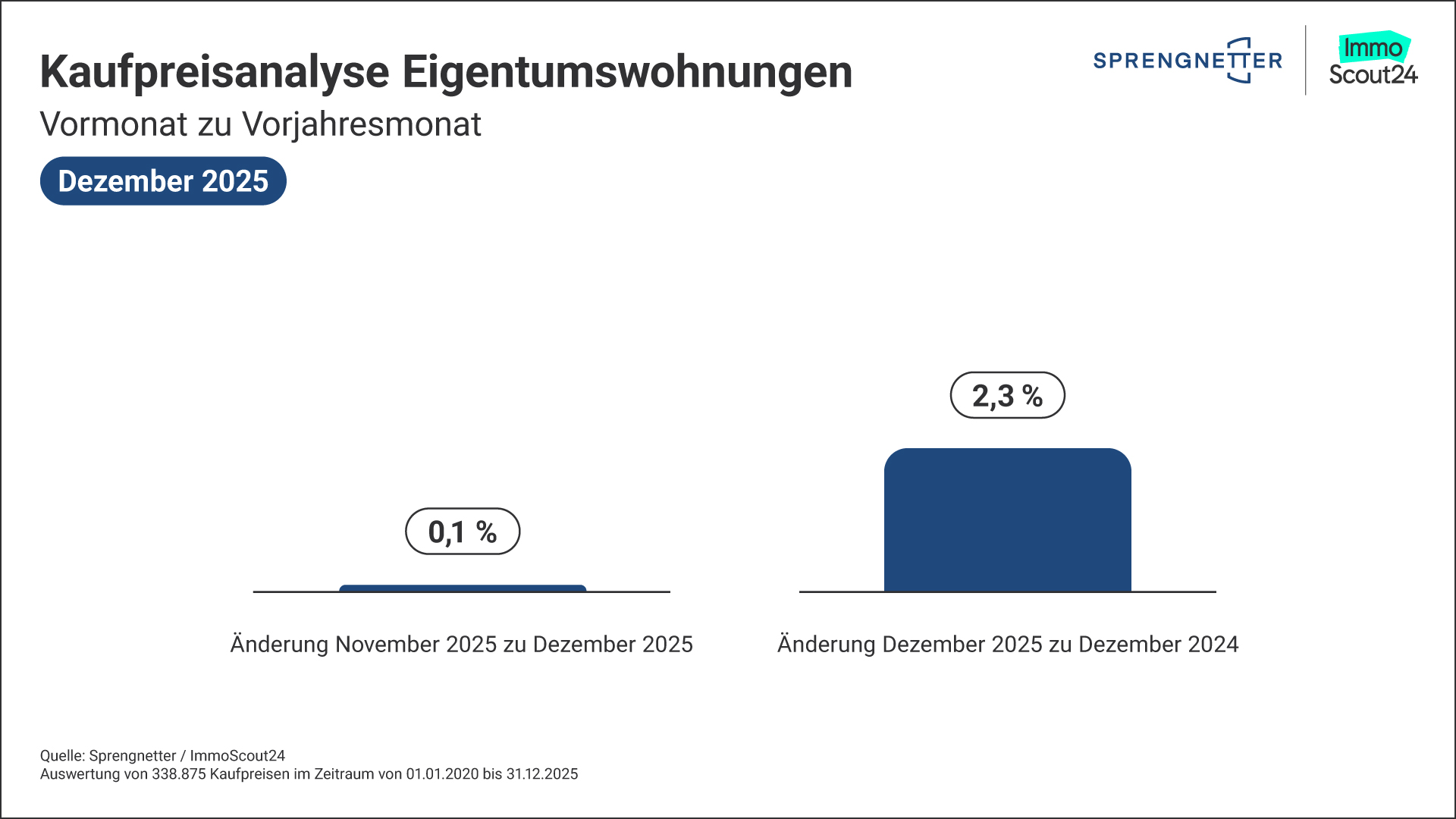 Die Kaufpreise für Wohnimmobilien in Deutschland sind auch im Dezember 2025 weiter gestiegen. Wie aus der aktuellen Sprengnetter-Analyse hervorgeht, zeigt sich eine moderate Aufwärtsbewegung im Monatsvergleich: Einfamilienhäuser verteuerten sich im Dezember um +0,4 Prozent gegenüber November, Eigentumswohnungen legten um +0,1 Prozent zu. Im Vergleich zum Vorjahr legen die Eigentumswohnungspreise im bundesweiten Schnitt +2,3 Prozent zu. Die Preise für Einfamilienhäuser verzeichnen mit +1,8 Prozent ebenfalls ein deutliches Jahresplus.
