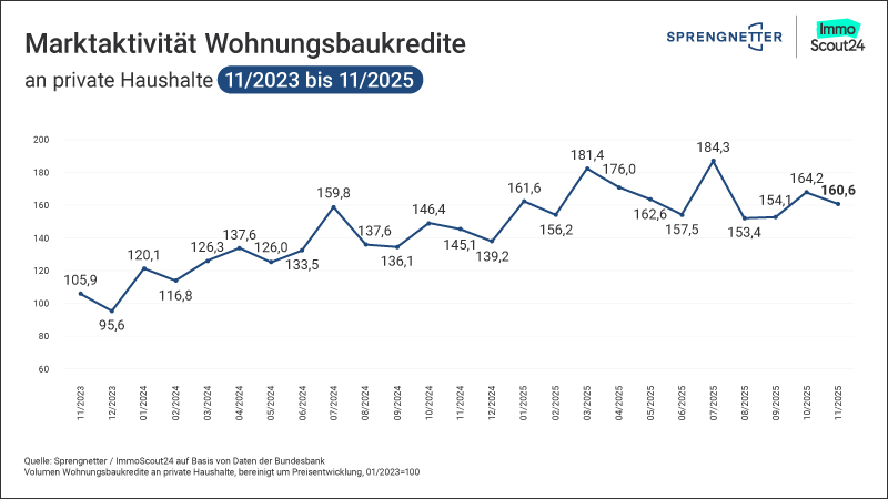 Der Marktaktivitätsindex, der das Volumen neu vergebener Baufinanzierungen an private Haushalte um die Preisentwicklung bereinigt und damit die tatsächliche Marktdynamik abbildet, liegt im November 2025 bei 160,6 Punkten und damit deutlich über dem Vorjahreswert von 145,1 Punkten. Die preisbereinigte Betrachtung zeigt, dass die Steigerung nicht nur auf nominale Effekte zurückzuführen ist, sondern eine echte Markterholung widerspiegelt.