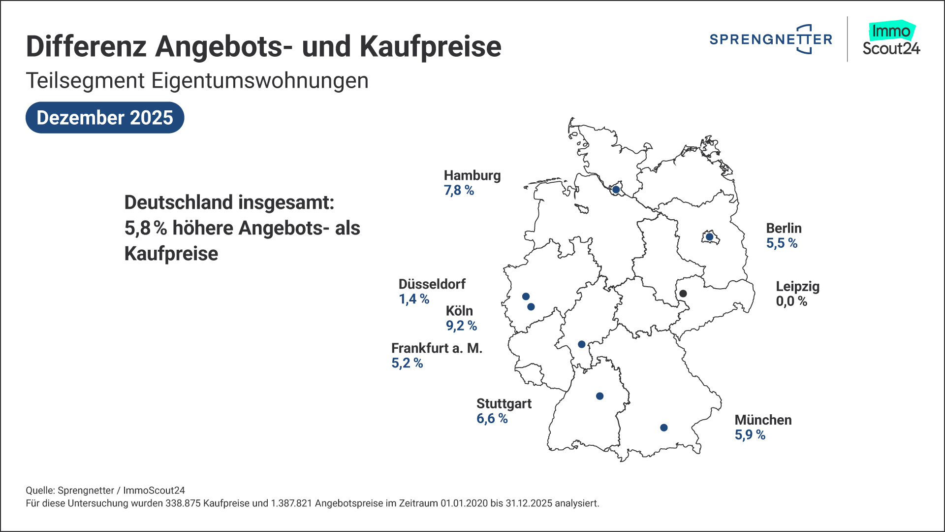 - Angebots- und Transaktionspreise nähern sich deutlich an: Verhandlungsspielraum sinkt auf 5,8 % im bundesweiten Durchschnitt – niedrigster Wert seit Langem.
