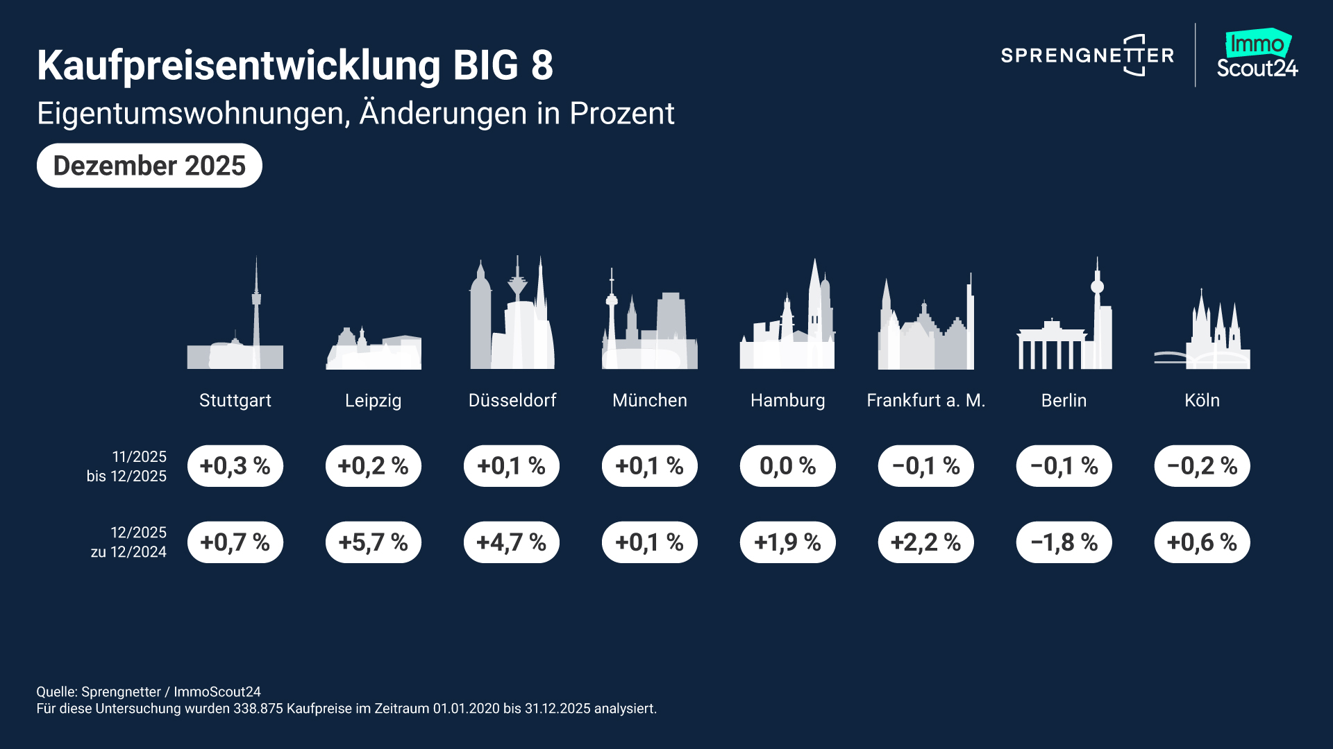 Bei den Eigentumswohnungen zeigt sich ein ähnliches Bild: Leipzig führt mit +5,7 Prozent im Jahresvergleich, dicht gefolgt von Düsseldorf mit +4,7 Prozent. Frankfurt am Main (+2,2 %) und Hamburg (+1,9 %) verzeichnen ebenfalls stabile Zuwächse. München zeigt sich mit +0,1 Prozent stabil, während Stuttgart (+0,7 %) und Köln (+0,6 %) moderate Zuwächse aufweisen. Berlin ist die einzige Metropole mit einem Rückgang von -1,8 % im Jahresvergleich.